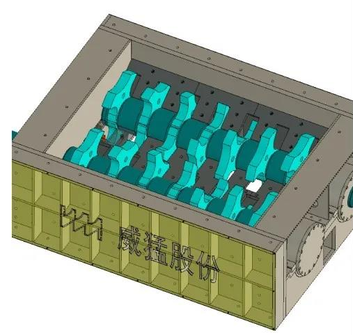 威猛股份生產(chǎn)的剪切式雙軸撕碎機(jī)是利用機(jī)械剪切力將生活垃圾等固體廢棄物破碎成適宜尺寸的設(shè)備,其中定刀安裝于箱體兩側(cè),動刀固定在可旋轉(zhuǎn)的軸上,通過驅(qū)動傳動軸帶動動刀旋轉(zhuǎn),動刀與定刀通過緊密配合像剪刀一樣將進(jìn)入的物料剪碎,以此來控制物料粒徑。剪切式雙軸撕碎機(jī)對木質(zhì)、塑料、金屬、橡膠等固體廢棄物均有很好的破碎效果。剪切式雙軸撕碎機(jī)可根據(jù)不同的物料進(jìn)行設(shè)計(jì),根據(jù)產(chǎn)品的后續(xù)處理選擇不同的物料粒徑,采用合適的刀具形式和材質(zhì),選擇液壓馬達(dá)或減速電機(jī)作為驅(qū)動,以達(dá)到更好的破碎效果。