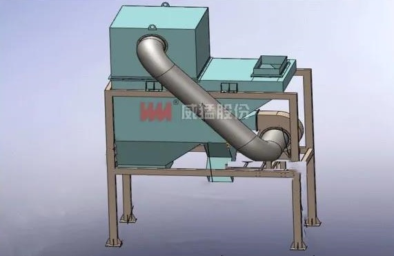 輕物質(zhì)分離器包括機架、風(fēng)管風(fēng)選箱及離心風(fēng)機等部分。風(fēng)選箱固定在機架上,風(fēng)選箱具有物料進口、重物質(zhì)出口和輕物質(zhì)出口。風(fēng)選箱內(nèi)設(shè)有下料坡面,下料坡面的上端位于風(fēng)選箱的物料進口處,下端與重物質(zhì)出口相連,下料坡面的背面連接有吹風(fēng)裝置。該設(shè)備在運行時,物料從進口進入風(fēng)選箱,在重力的作用下,物料沿下料坡面自動滑落,物料滑落到重物質(zhì)出料口處時,吹風(fēng)裝置將建筑垃圾中的輕物質(zhì)吹到輕物質(zhì)腔里收集后處理,重物質(zhì)則通過重物質(zhì)出料口排出風(fēng)選箱。