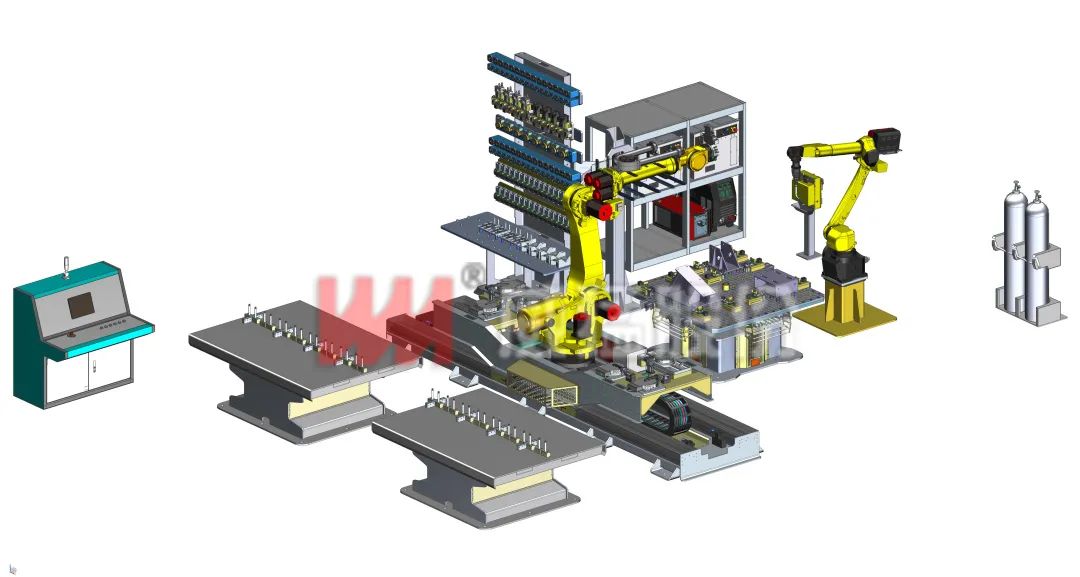 威猛股份開(kāi)發(fā)的柔性拼裝焊接單元,根據(jù)工裝的特定需求,有針對(duì)性的柔性選取對(duì)應(yīng)夾裝工具,在特定工作平臺(tái)上快速搭建出工裝模型,進(jìn)而順利開(kāi)展后續(xù)的對(duì)接及焊接工作,在批量焊接任務(wù)完成后,自動(dòng)完成工裝拆卸并且能夠循環(huán)使用。此單元的核心在于“數(shù)字化柔性工裝”,致力于解決多種類、多規(guī)格、多批次、少批量產(chǎn)品的焊接作業(yè)問(wèn)題。
