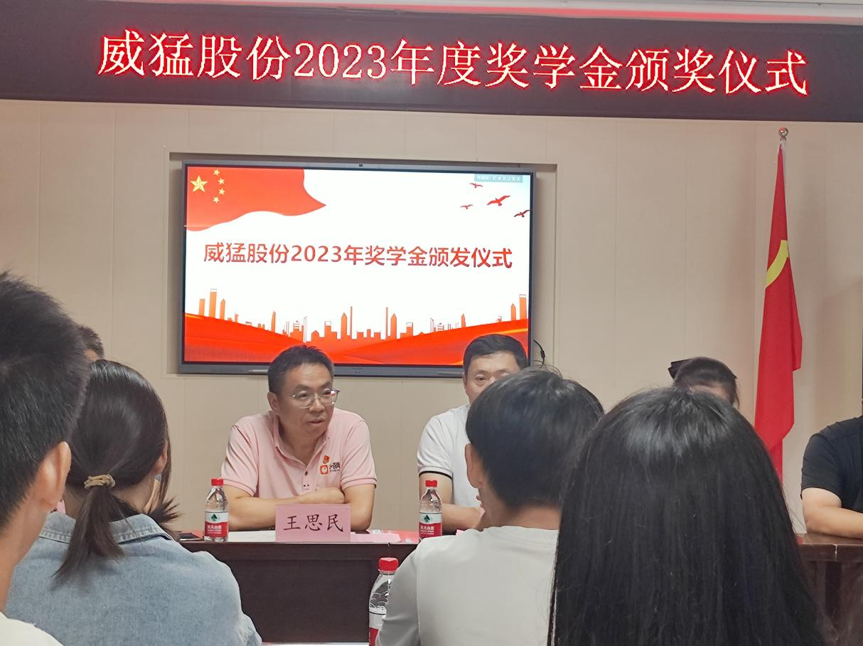 8月26日下午,威猛股份在公司威猛學(xué)院隆重舉行2023年度“威猛獎(jiǎng)學(xué)金”和“思民獎(jiǎng)學(xué)金”頒獎(jiǎng)儀式。參加儀式的主要領(lǐng)導(dǎo)有縣委統(tǒng)戰(zhàn)部常務(wù)副部長、縣工商聯(lián)黨組書記魏斌,縣慈善協(xié)會(huì)副會(huì)長徐世本,縣團(tuán)委書記付萌,翟坡鎮(zhèn)黨委副書記張鵬,翟坡西村村書記王延勝,翟坡東村村書記徐興濤,寺王村村書記王澤平,威猛股份總經(jīng)理王思民,以及獲得獎(jiǎng)學(xué)金的學(xué)生及學(xué)生家長。